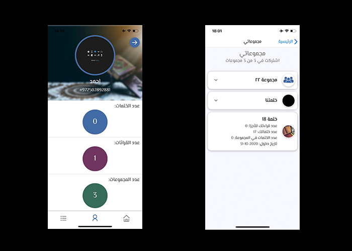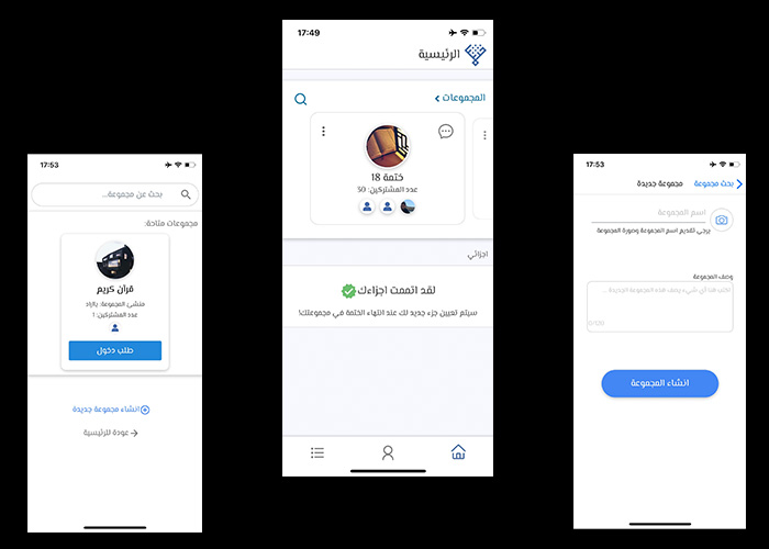 بعد تحميل تطبيق ختمتنا ستتمكن من انشاء أو بحث وطلب دخول مجموعة حتى 3 مجموعات. اجزاءك ستكون متاحة في صفحة الرئيسية لكل مجموعة